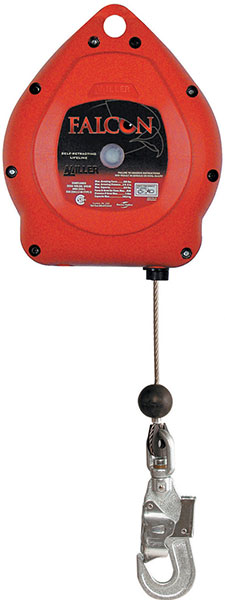 Dispositivo anticaduta retrattile (mod. Falcon+) con cavo in acciaio galvanizzato ø 4,5 mm, carter in nylon ad alta resistenza contro gli impatti, meccanismo di richiamo automatico, moschettone con chiusura automatica e indicatore di caduta, meccanismo di bloccaggio ad azione rapida con arresto veloce in pochi centimetri, testato a 160 kg ed approvato anche per applicazioni orizzontali se utilizzato con moschettone a ghiera e braca di ancoraggio da 1m.