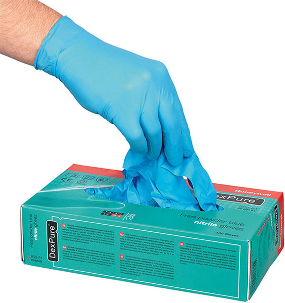 Guanti monouso in nitrile (mod. Dexpure 800-91), colore blu, con leggero strato di polvere (AQL1,5), spessore 0,1 mm, lunghezza totale 240 mm, finitura di presa ruvida, con trattamento antibatterico, idonei per soggetti allergici al lattice naturale, maggior resistenza meccanica ed agli oli rispetto al lattice, maggiormente individuabili per la loro colorazione nei processi lavorativi dell?industria agroalimentare, certificati per il contatto con alimenti, indicati anche nella manipolazione di metalli e lavori di laboratorio.