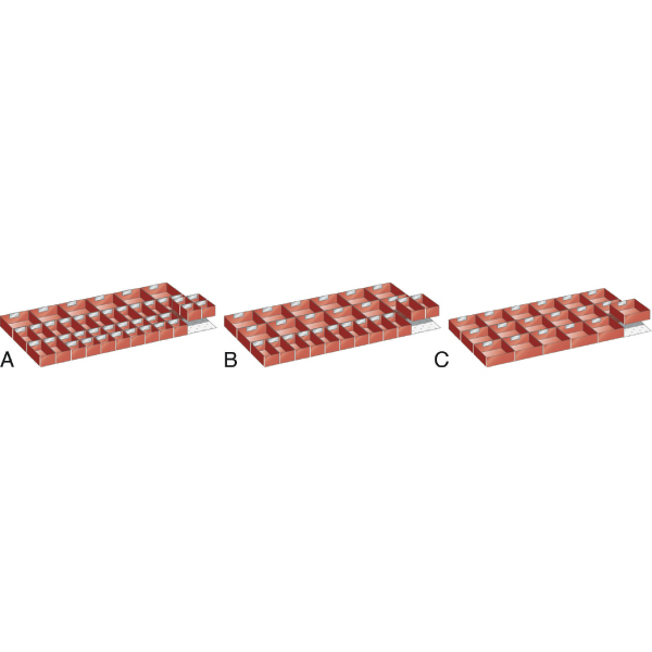 | Codice | € | Altezza frontale cassetto mm | Fig. | N° totale vaschette | Vaschette (n° / misura mm) | Vaschette (n° / misura mm) | Vaschette (n° / misura mm) |