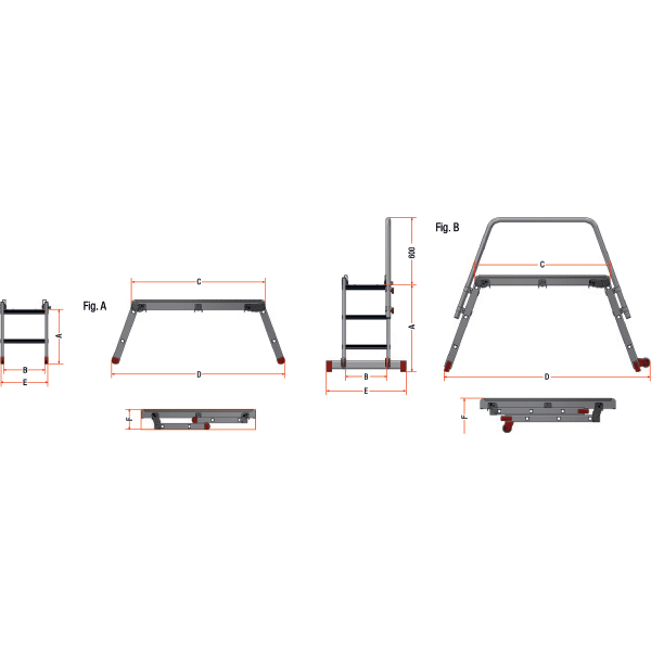 | Codice | € | N° gradini¹⁾ | Fig. | A mm | B mm | C mm | D mm | E mm | F mm | Peso Kg |