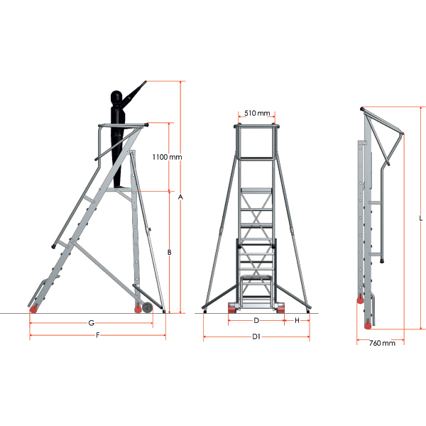 | Codice | € | N° gradini¹⁾ | A mm | B mm | D mm | D1 mm | F mm | G mm | H mm | L mm | Peso Kg |