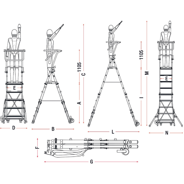 | Codice | € | N° gradini¹⁾ | A mm | B mm | C mm | D mm | E mm | F mm | G mm | I mm | L mm | M mm | N mm | Peso Kg |
