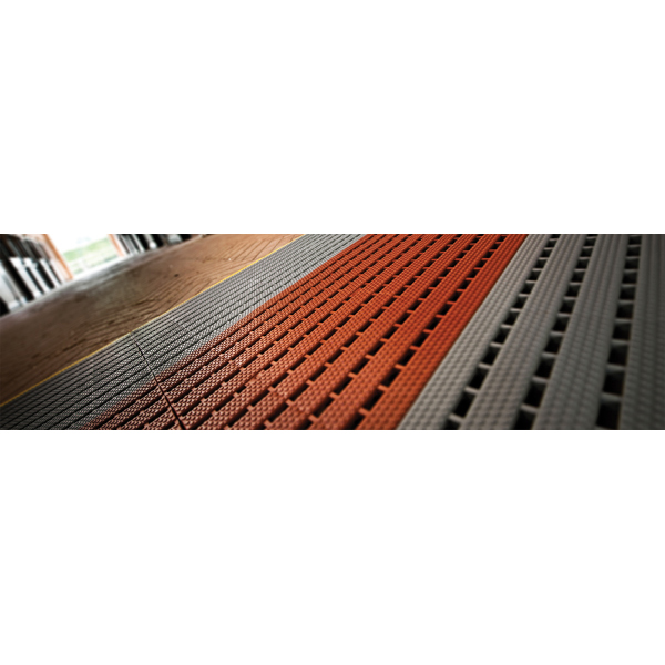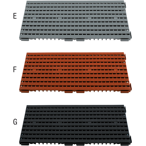 Tappeto antisdrucciolo modulare in polietilene a bassa densità con portata statica di 5000 Kg/m2 per l'assemblaggio di pedane negli spazi di lavoro, disponibile con celle chiuse o forate, ottima adesione al pavimento sia con che senza carico, senza smussature per evitare gli inciampi, superfici con rilievi canalizzati per favorire la percorribilità in condizioni di umidità. Particolarmente adatto nelle officine meccaniche, nelle industrie per la lavorazione del metallo, negli impianti di lavaggio e nelle industrie alimentari. Ogni tappeto presenta degli agganci maschio/femmina opposti sui due lati per facilitare l'assemblaggio; per la completa sicurezza ed ergonomia le pedane vanno completate perimetralmente con le rampe di raccordo lineari e ad angolo, fissando definitivamente nella parte inferiore tutti gli elementi con le clip di aggancio zincate.