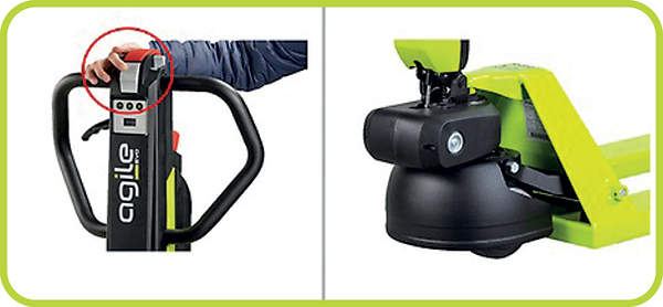 | Codice | € | Portata Kg | Velocità senza carico max Km/h | Potenza motore trazione / sollev. W | Tensione batteria V | Capacità batteria Ah | N° rulli | Lunghezza forche mm | Larghezza forche mm | Altezza dal suolo min/max mm | Peso Kg |