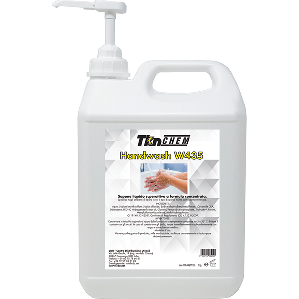 Liquido lavamani concentrato superattivo Handwash W435 formulato specificamente per l'impiego in ambienti lavorativi con sporco particolarmente tenace, materie prime di alta qualità per la massima efficienza e dermocompatibilità, non contiene abrasivi silicei, colore arancione rosato con profumo di essenze floreali. Risponde alle normative sui prodotti cosmetici. Impiego in: officine meccaniche, officine di riparazione auto e industria.