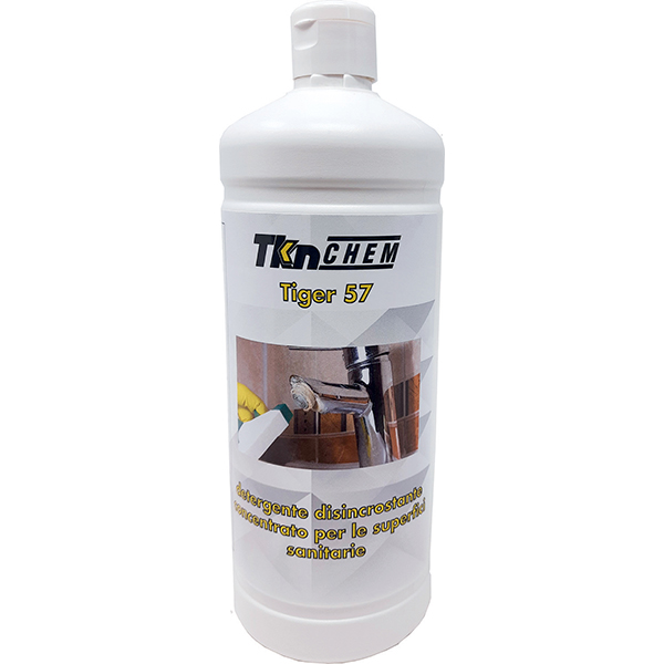 Detergente disincrostante Tiger 57 per la pulizia di superfici sanitarie negli uffici e nei servizi degli stabilimenti, indicato per sciogliere calcare, incrostazioni, macchie di ruggine, residui e velature di cemento. Disincrosta, pulisce e deodora senza danneggiare le superfici cromate; se utilizzato su cromature non in buone condizioni il colore del materiale può cambiare. Colore rosso rosato con profumazione bouquet. Ideale per bagni, docce, piscine, piastrelle e porcellane resistenti agli acidi nonché sanitari in ceramica di alberghi, scuole, ospedali, comunità, locali pubblici e industrie. Applicare il prodotto, diluito dal 5 al 20% a seconda del grado di sporco da eliminare, con una spazzola o una spugna; lasciare agire per il tempo necessario e risciacquare abbondantemente con acqua. Per parti porose, come le fughe delle piastrelle, bagnare le superfici con acqua prima di applicare il prodotto. Non utilizzare su marmo, rame, alluminio o superfici sensibili agli acidi.