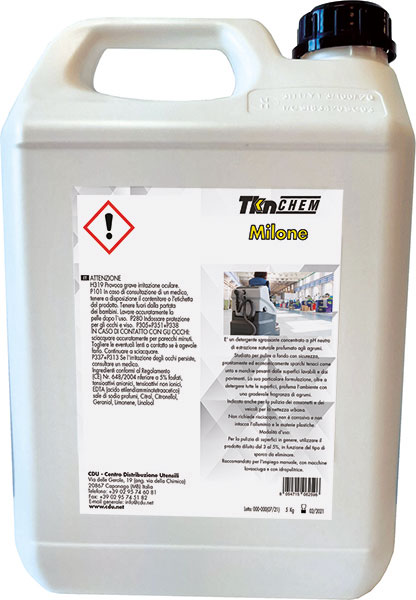 Detergente sgrassante Milone, concentrato a pH neutro e di estrazione naturale, formulato per pulire a fondo con sicurezza sporchi tenaci come unto e morchie pesanti dalle superfici lavabili e dai pavimenti. Colore giallo con profumazione di agrumi. Indicato anche per la pulizia dei cassonetti e dei veicoli per la nettezza urbana. Non richiede risciacquo, non è corrosivo e non intacca l?alluminio, le materie plastiche e la quasi totalità delle vernici industriali. Per la pulizia di superfici in genere, utilizzare il prodotto diluito dal 3 al 5%, in funzione del tipo di sporco da eliminare. Raccomandato per la pulizia delle pavimentazioni di ogni genere dei reparti produttivi, per l?impiego sia manuale che con macchine lavasciuga, con una diluizione dal 5 al 15%. Rimuove prontamente e facilmente le strisciate lasciate dalle gomme dei muletti.