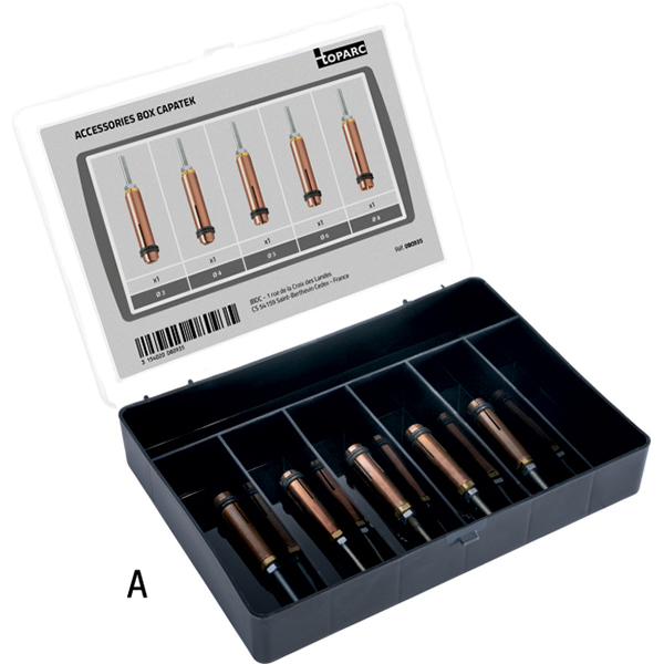 Kit di 5 mandrini portaperni per pistola a retrazione del generatore mod. GYSTUD CAPATEK 66 FV, completi di vite di registro e controdado, in valigetta di plastica.