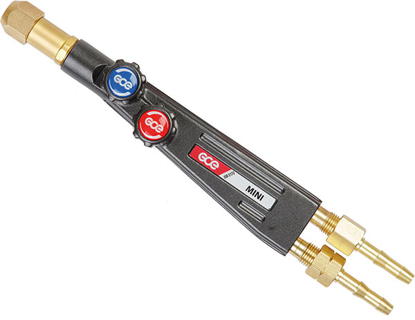 Impugnatura serie Mini ad alimentazione ossigas, corpo in monoblocco di alluminio stampato ed anodizzato, volantini di regolazione in alluminio, ghiera filettata portalance in ottone, portagomma smontabili per tubo ø 6,3 mm con dadi esagonali da 1/4" G, possibilità di montare lance per saldatura, brasatura, riscaldo e taglio. Conforme alla norma EN ISO 5172.