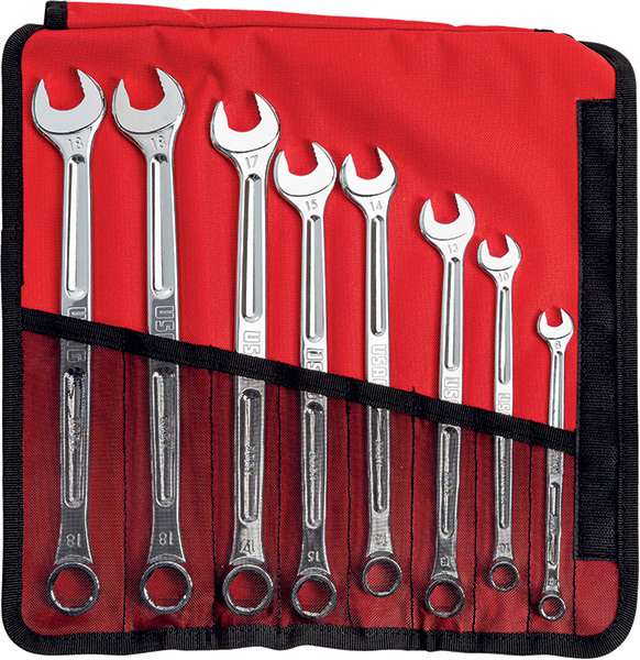 Serie di chiavi combinate con forchetta ed anello con profilo X-Grip, fornite con busta avvolgibile in tessuto tecnico.