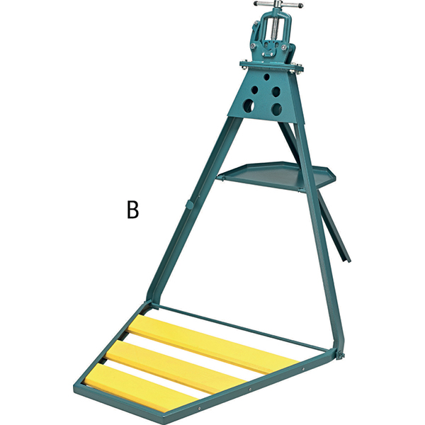 Banco con morsa per tubi, con morsa modello ribaltabile in acciaio fucinato, ganasce intercambiabili in acciaio temprato, esecuzione verniciata, sezione superiore della morsa sganciabile attraverso l'azionamento della leva. Pedana pieghevole e richiudibile per garantire stabilità al banco, mensola per appoggiare gli utensili, piastra piegatubi con 5 diametri.