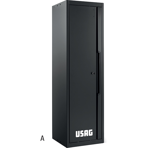 Armadio con 1 anta battente, con maniglia per apertura in ABS ad alta resistenza, 3 ripiani interni regolabili in altezza e resistenti a un carico di 50 kg, passo per la regolazione dei ripiani da 100 mm, barra appendi abiti applicata sotto a un ripiano, serratura a chiave, struttura in lamiera d'acciaio con verniciatura epossidica.