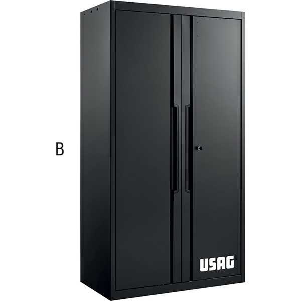 Armadio con 2 ante battenti, con maniglia per apertura in ABS ad alta resistenza, 3 ripiani interni regolabili in altezza e resistenti a un carico di 75 kg, passo per la regolazione dei ripiani da 175 mm, barra appendi abiti applicata sotto a un ripiano, serratura a chiave, struttura in lamiera d'acciaio con verniciatura epossidica.