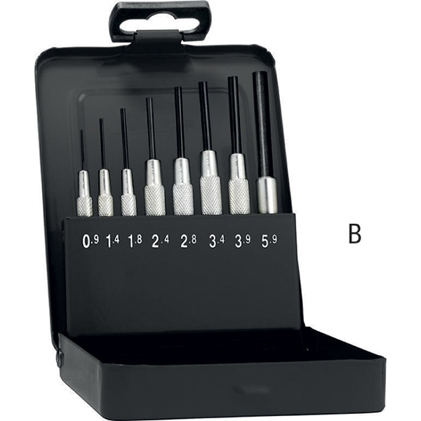 Serie di cacciaspine con bussola di guida, in acciaio al cromo vanadio, fornita in cassetta metallica.